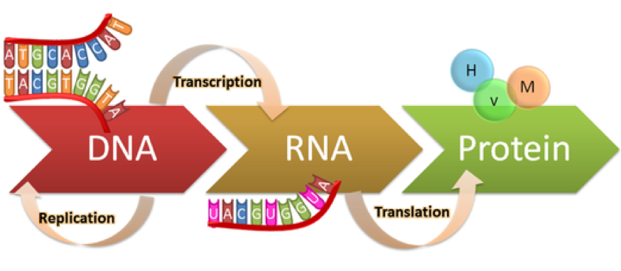 Gene expression biomarkers are valuable for their ability to tell us what a coral is doing on a physiological level. All living organisms have between hundreds and thousands genes in their genetic code, but not all of those genes are being used all the time. In fact, different parts of our bodies turn on and off different genes depending on what they need to accomplish. Corals do the same thing—they often change which genes they turn on and off depending on their environment. So, we can dig deeper into how corals are responding to stress in their environment by looking which genes they are expressing, or which genes are turned on and off. Though all of the organism’s genes are contained in its DNA, only genes transcribed into RNA are being expressed. The entire set of expressed genes is known as a transcriptome, and proteins that the organism needs can be made from genes that are available in the transcriptome (Fig 2).