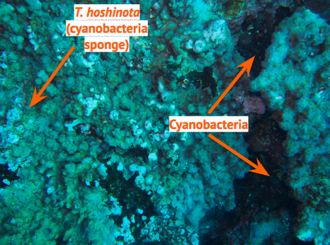 Figure 2: An example of the macroalgae genera found at sites with low human influence and high NDVI (left), versus the encrusting sponge Terpios hoshinota and cyanobacteria more common at sites with high human influence and low NDVI (right).