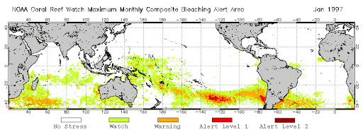 For example, every few years our climate shows natural variations that have important consequences to our oceans. This includes the El Niño-Southern Oscillation (ENSO) System, which is an important climate phenomenon that can be traced based on geochemical and sclerochronological studies. One of the most disastrous consequences of this climate phenomenon to modern coral reefs is the triggering of coral bleaching through higher than normal seawater temperatures, which can lead to mass mortality. This stressful period will be recorded in the coral skeleton as a moment of very poor growth, since most of the organism’s energy is going into staying alive!