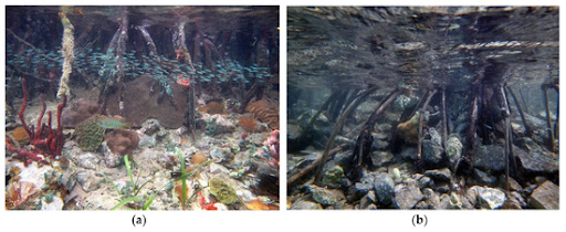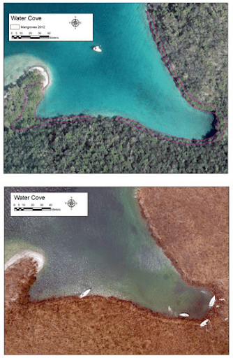 The mangroves of St. John provide an uncommon link between the terrestrial and marine environments on the island, and researchers have found that coral species have been demonstrated to use the underwater roots of the mangroves as a building substrate. Previous studies suggest that shade from mangrove trees keeps water and light levels in a preferable range for coral survival, and even increases survival in study sites where bleaching and mortality havehas been observed in the same species of coral that is not growing under the shade of a tree. Waves and debris from the hurricanes removed most large corals and sponges in the mangroves and stripped the mangrove roots (Figure 2). Furthermore, above-ground destruction of mangrove trees decreased the shade in the Water Creek study site, effectively removing the variable water temperatures and low light levels in the bay which previously allowed corals to thrive there.
