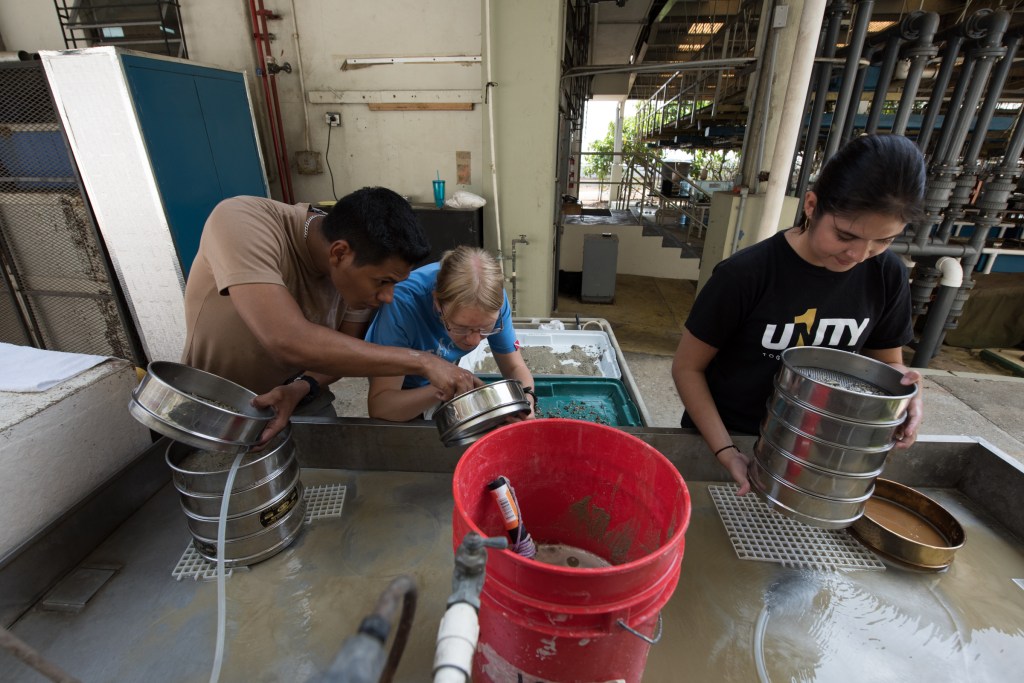 Previously, dermal denticles and fish teeth accumulating in marine sediments have been used in deep time to investigate changes in fish communities over millions of years. Collaborators and I set out to explore whether denticle assemblages could be used a proxy for shark abundance over the last several thousand years – a timescale relevant to thinking about how humans have impacted sharks. Specifically, we’ve been developing an approach to recover denticles from coral reef sediments, test their ecological fidelity, and interpret this record. So far, we’ve discovered that denticle assemblages retain ecological information about past shark communities and can preserve a time-integrated signal of shark abundance in low energy reef environments. We’re now applying this technique to reconstruct patterns of change in relative shark abundance over time in the Caribbean and Pacific. This research is part of a larger project that uses the recent fossil record to reconstruct entire reef ecosystems before humans. Our work aims to leverage the past to help characterize historical ranges of variation, advance our understanding of long-term ecological shifts, and guide management targets based on local expected conditions.