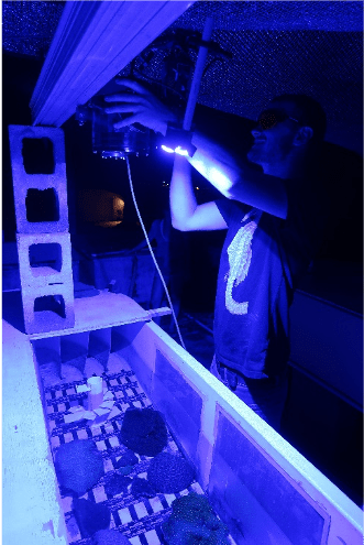 My research involves studying the loss in colour as corals bleach, associated with the loss of symbionts namely Symbiodiniaceae and fluorescent proteins. This is achieved using a device called a Hyperspectral camera. While most everyday cameras image in three bands or colours (Red Green Blue or RGB), a Hyperspectral camera scales this up and can image in hundreds of bands across the whole spectrum of visible light. The outcome of this is a camera that can very accurately image very slight changes in the amount of light and colour. By measuring specific colours (or wavelengths) that correspond to key pigments naturally occurring in the coral, such as fluorescent pigments; green fluorescent proteins (GFP) 511nm (green) (not present in all corals but most common fluorescent colour) and chlorophyll 685nm (deep red) as well as pigments visible in reflectance (natural light), we can monitor the change in strength or intensity of these light signals to estimate how ‘bleached’ or ‘healthy’ a coral is by comparing against a baseline of a healthy coral.