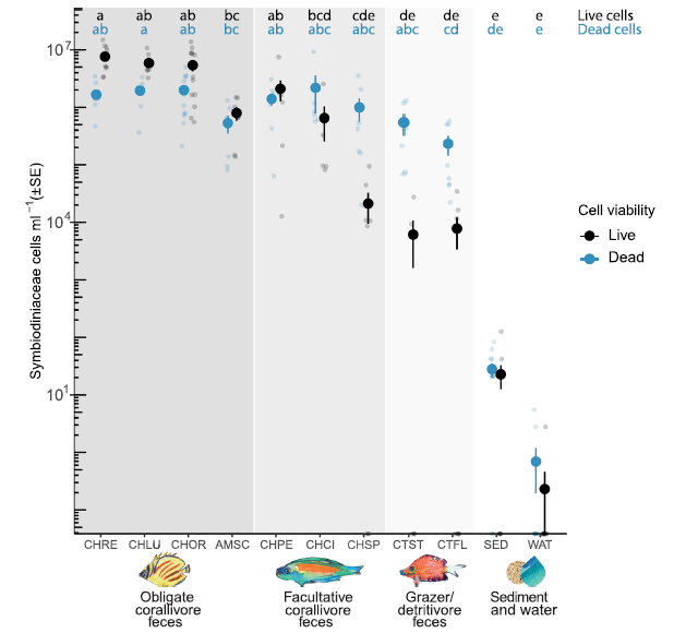 What they found was astonishing! Live Symbiodiniacea could be found in all samples of obligate corallivores, over 80% of facultative corallivores, and even in over 30% of non-coral feeder’s feces. Obligate corallivores had 4-7 orders of magnitude more live symbionts in their feces than sediment or water samples, and facultative corallivores also had several orders of magnitude more live Symbiodiniacea (Figure 1). It appears these species have a great capacity to export live symbionts from their diet to other corals. The authors even tried to calculate the approximate transfer of symbiont cells from fish feces. By measuring rates of fecal discharge and combining this with the density of live symbionts standardized per volume of feces, the authors were able to estimate that millions of symbionts are potentially released by obligate corallivores alone, enriching the environment with Symbiodiniacea that could be used by coral species.