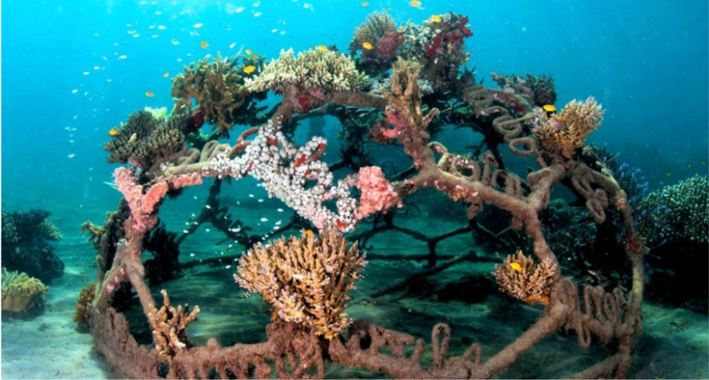 Because of the continuous harvesting of coral fragments being detrimental for the donor reef, a more sustainable model was developed. Using the method of coral gardening, coral recruits or small fragments are raised in intermediate nurseries (Fig. 2) prior to outplanting on the restoration sites. Because of the sensitivity of early life stages of coral fragments, the nursery stage protects the corals from damaging conditions. In addition, nurseries provide a reservoir for new coral fragments that can be broken into smaller pieces and grew again in the nursery, thus avoiding collections from the natural reef. On average, 66% of corals survived the outplanting phase. To improve growth and survival rates of coral fragments, the nursery phase can be carried out in-situ (field-based) or ex-situ (land-based), depending on the local conditions.
