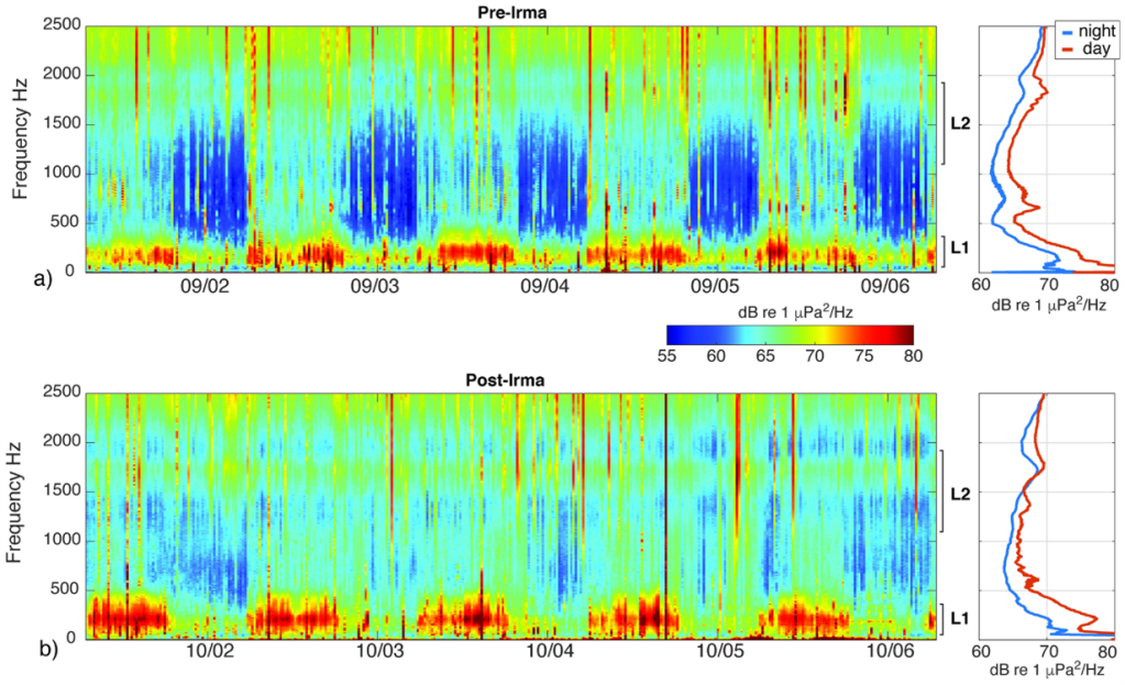 To complicate this relationship further, major storms do not always have a significant effect on the reef. After observing the soundscape (a measure of reef health discussed previously) of a Florida Key reef during Hurricane Irma, researchers observed only minor shifts in acoustic activity. The daily acoustic patterns of the coral reef, “…were relatively resilient to acoustic energy exposure during the storm.”