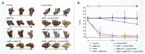 Results showed that fragments exposed to the oil alone looked negatively affected, as tissues paled. However, the exposure to the chemical dispersant Corexit 9500 severely affected the coral health shortly after application, inducing bleaching and tissue death after the 4th and 13th day of treatment, respectively. Contrary to the use of the chemical dispersant, the application of the pBMC-BC was able to mitigate the negative effects of the oWSF, maintaining an high Fv/Fm and florid tissue colour. A significant decrease of PAHs and n-alkanes, associated with improved coral health, further indicated the degradation of oil fractions. Thus, results indicate that the use of pBMC-BC for oil spill remediation is superior to a traditional oil dispersant and bodes well for less harmful bioremediation methods. Results are visually represented in Figure 1.