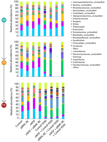 Results (Fig. 2) could not confirm that the pBMC-BC isolates were present among the coral microbiome, however the phylogenetic orders they represent maintained their relative abundance in all treatments, except those using the chemical dispersant. Indeed, the structure of the bacterial communities associated with the coral host in the presence of Corexit 9500 was significantly different from treatments without the use of the dispersant.