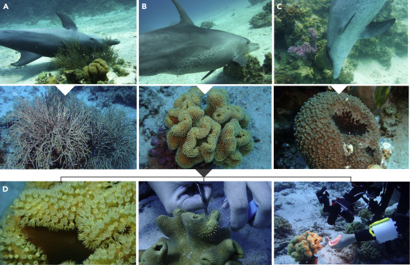 Dolphins target specific invertebrates on coral reefs In their study, Morlock et al. used photo and video identification to observe group behavior and composition, location and features of targeted invertebrates. The dolphins specifically targeted three different marine invertebrates: a gorgonian coral (Rumphella aggregata), the leather coral (Sarcophyton sp.), and a sponge (Ircinia sp.) (Figure 1).