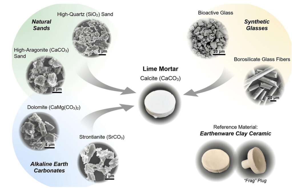 First, the authors chose what kinds of inorganic materials to evaluate (Figure 1). One of the materials chosen was sand, which typically adds strength to cement and other substrates. Both quartz-rich sand and high aragonite sand were used; these choices were intended to compare non-calcium based sand (quartz) and sand typically found on reefs (aragonite). Synthetic glasses, specifically bioactive glass power and borosilicate glass fibers, were also chosen as another inorganic material. Glass fibers are typically added to materials to increase the strength of composite resins, and bioactive glass aids in bone growth and coral skeletal mineralization. Lastly, strontianite (SrCO3) and dolomite (CaMG(CO3)2), which are similar to materials that corals build their skeletons with, were evaluated in the larval settlement experiment. Both strontianite and dolomite are alkaline earth carbonates and are often used in aquariums to maintain coral mineralization. These inorganic materials were mixed with lime mortar to make settlement plugs. Additionally, the authors used earthenware clay ceramic plugs, which are typically used in settlement trials, as a reference material.