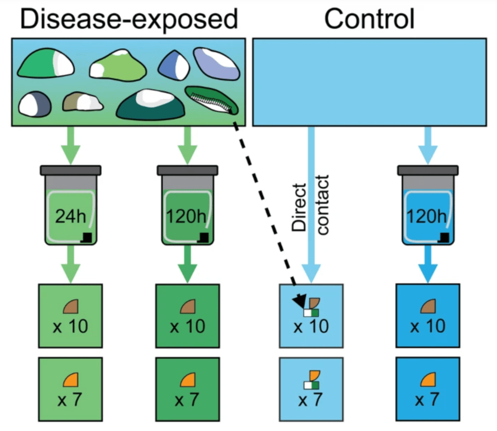Studivan’s team tested whether ballast water could be contributing to SCTLD spread by exposing healthy corals to three types of water: disease exposed, disease exposed and UV treated, and non-disease exposed (Figure 1). Ballast water is usually regulated by local, state, or federal agencies because it is already known as a potential vector for non-native species or disease spread. UV light is sometimes used to treat ballast water before it is re-released into local waters, as UV light exposure kills organisms and viruses in the water. A second experiment assessed whether holding the ballast water for 120 hours after SCTLD exposure would change the rate of disease transmission or progression (Figure 2).