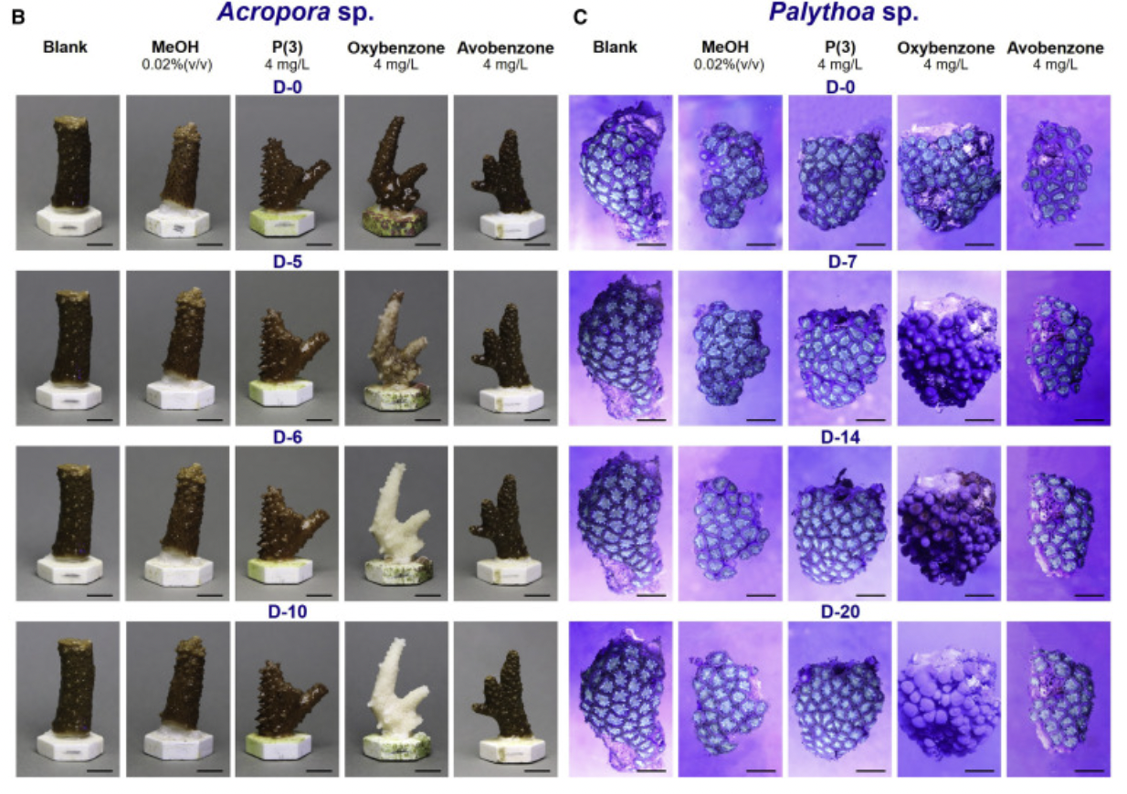 Figura 2. Un’immagine che mostra la progressione della salute dei coralli nel tempo dopo l’esposizione a vari trattamenti. Il gruppo di controllo (Blank) e metanolo (MeOH) sono serviti come controlli, P(3) è il nuovo polimero blocca-UV, l’ossibenzone è un composto presente nelle creme solari comuni e l’avobenzone è un composto presente nelle creme solari più rispettose dell’ambiente. I coralli rimangono sani quando esposti al polimero blocca-UV P(3), mentre sbiancano completamente quando esposti all’ossibenzone. Figura per gentile concessione di Zeng et. al 2023.