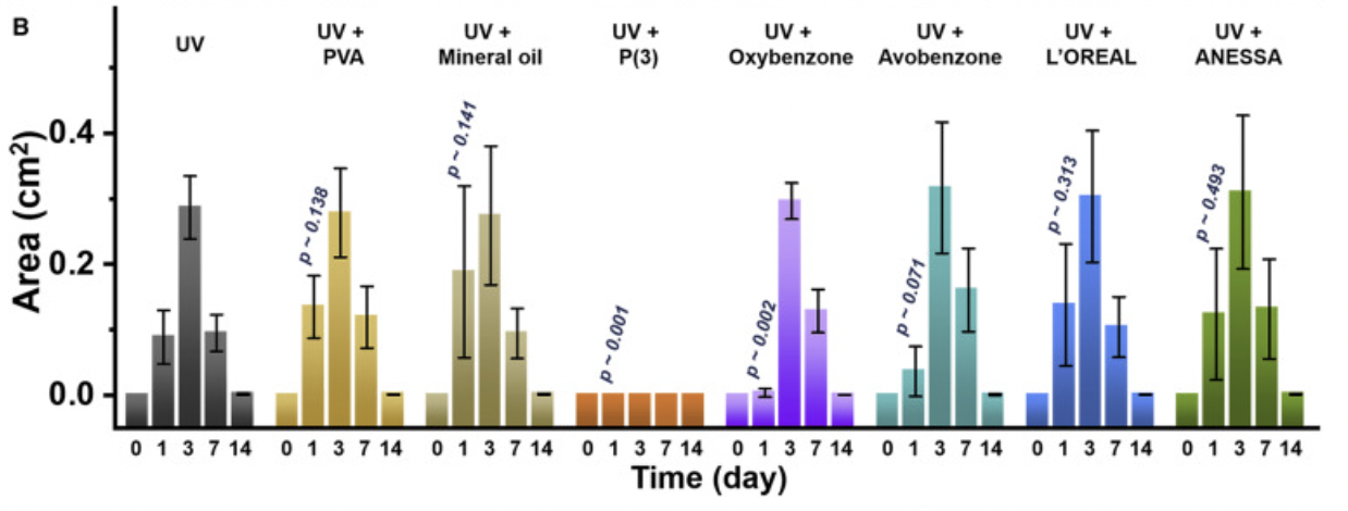 Abbildung 1. Diese Abbildung zeigt das Ausmaß der Hautläsion nach UV-Exposition bei Labormäusen nach der Behandlung mit verschiedenen Substanzen. Mäuse, die mit dem P(3)-UV-blockierenden Polymer behandelt wurden, entwickelten nach der UV-Exposition keine Hautläsionen. Dies war auch der Fall, wenn Mäuse, die mit Oxybenzon (Wirkstoff in den meisten Sonnenschutzmitteln) behandelt wurden, Läsionen entwickelten. P(3) war daher am erfolgreichsten bei der Blockierung schädlicher Strahlen. Abbildung mit freundlicher Genehmigung von MacKnight et al., 2022 .