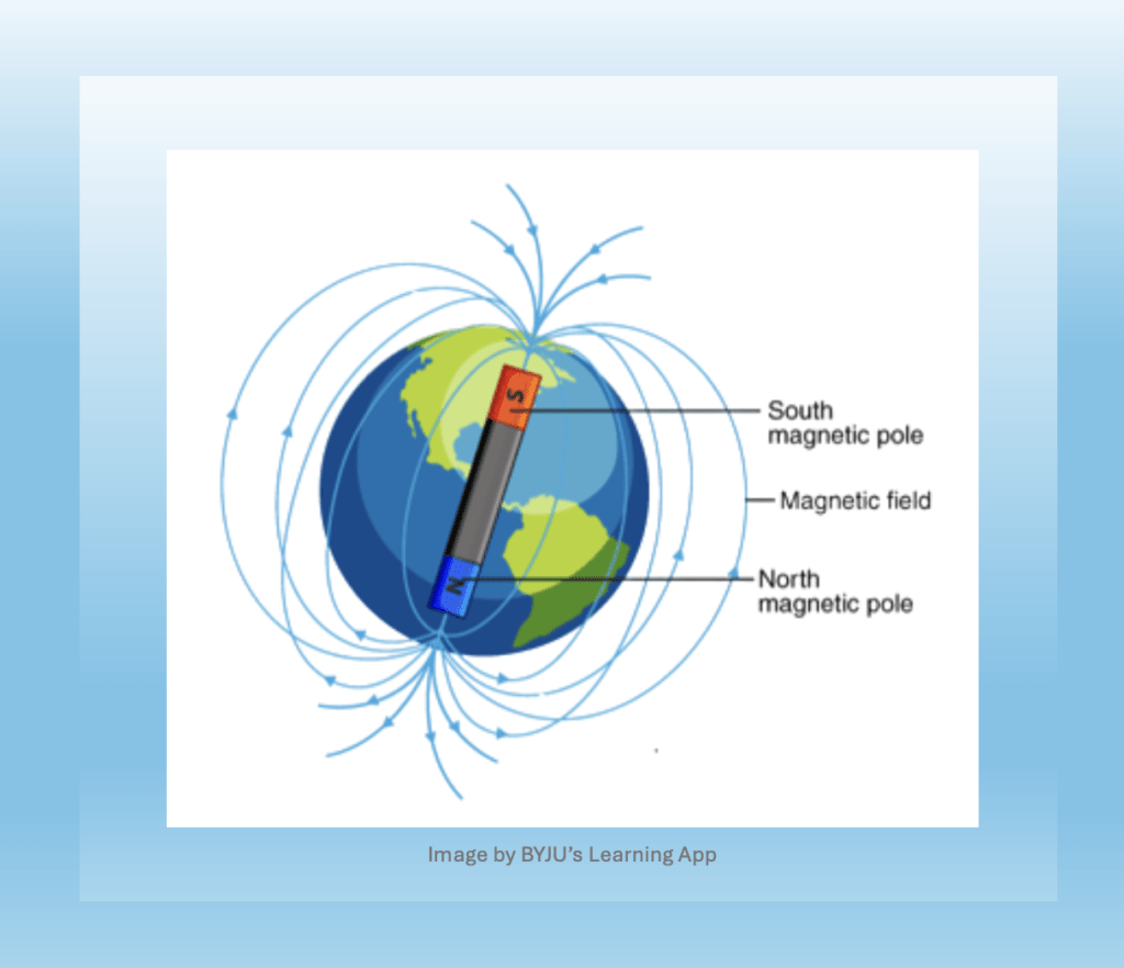 Figure 4. Design of the magnetic force fields about the earth, which vary in direction and intensity. The north tip of a compass needle is attracted to the geographic north pole, which is actually a magnetic south pole. Got that?
