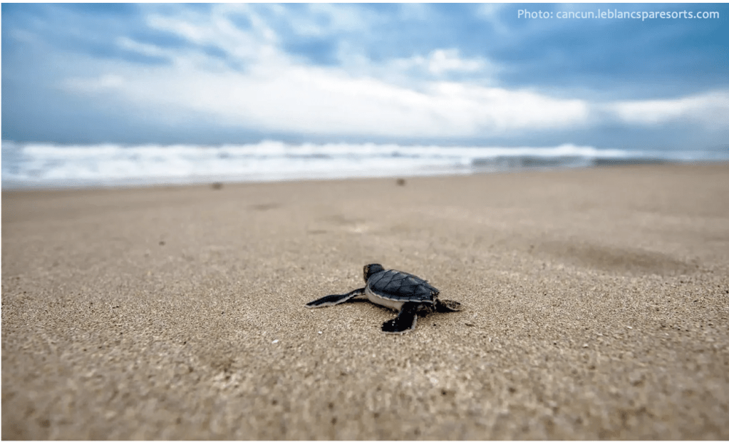 Figure 8. A newly hatched sea turtle orienting itself visually and magnetically into the ocean to begin its life. The magnetic coordinates of Its home beach and first journey are permanently imprinted into memory.