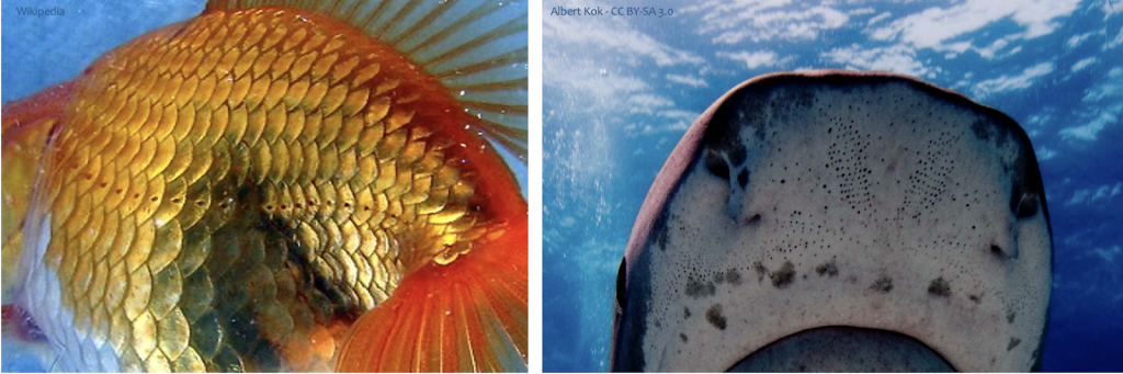 Figure 5. The pores that open to the lateral line system are visible in this oblique view of a goldfish (Carassius auralus) and the pores of the ampullae of Lorenzini are visible under the nostrils of a shark. These two systems of mechano- and electroreception are different, but they have a structural basis in common.