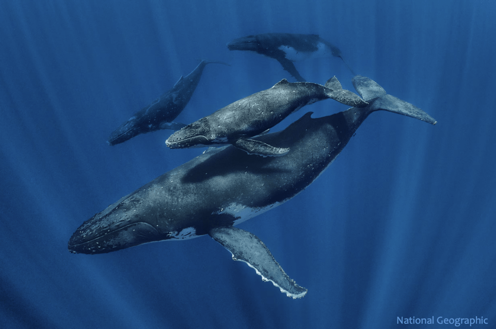 Figure 1. A mother humpback whale and her calf setting out on a journey with two other group members in the background acting as escorts. The young whale will remember the route and refine it in subsequent years.