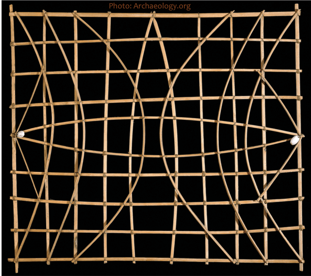 A thousand miles away, in Micronesia, Marshall Island navigators used their senses and memory to guide them on voyages by feeling how their canoes were rolled by underlying swells from waves that interacted with distant land masses. They created stick charts that encoded prevailing ocean wave crests as they approached different islands, which were marked with shells at the junction of bent sticks.