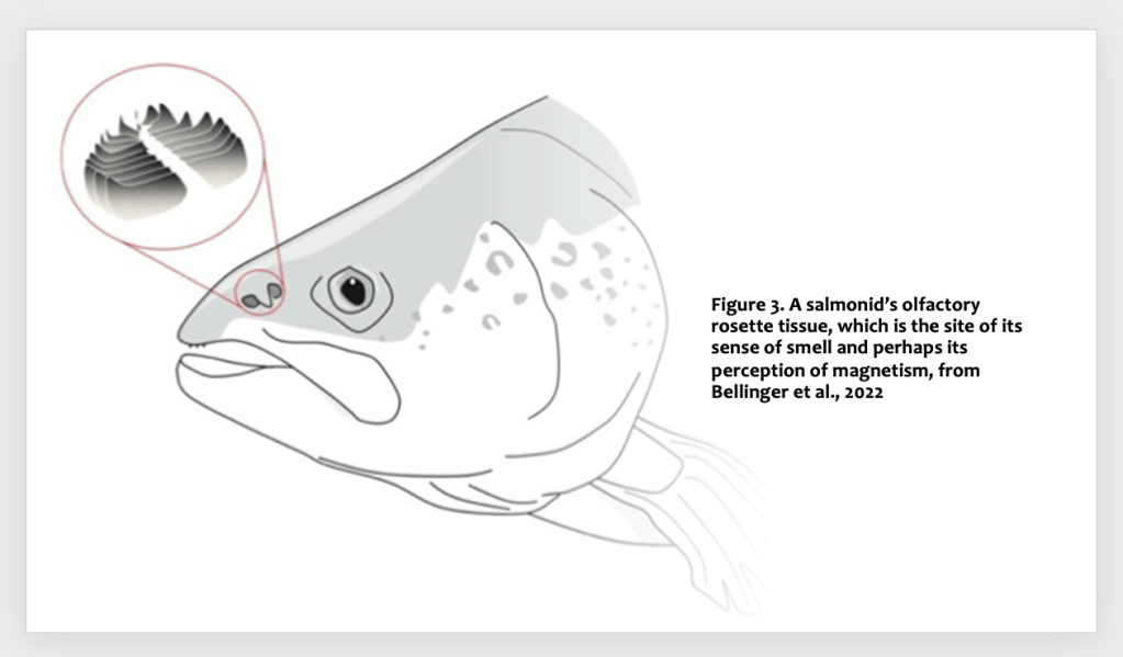 SCENT: Salmon are superstar scent navigators that travel from the ocean back to their home streams for spawning. The odor of their home stream is extraordinarily diluted in the ocean but becomes progressively more concentrated with each stream branch they select. Sharks are also renowned for their acute sense of smell, with up to two thirds of the total weight of their brains dedicated to olfaction. This sense can be used for migration and is also used for localizing prey. It is famously sensitive enough to smell one drop of blood diluted in a swimming pool of water.