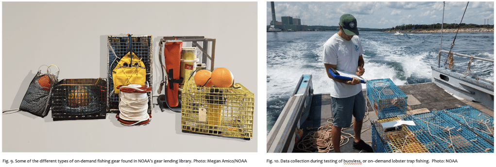 Fishers who wish to take advantage of fishing permit exemptions and reduce harm to marine life can explore the new technology at no cost by borrowing gear from NOAA’s “lending library” of ropeless systems. This allows them to become familiar with the different options by testing them in real life situations and to provide feedback that helps in the development of the new technology. This library houses hundreds of different ropeless fishing systems that have been donated by the government as well as environmental organizations. As seen in the photo below, alternative gear includes pop-up buoys, inflatable lift bags and buoyant spools that bring the traps to the surface and further details may be seen here.