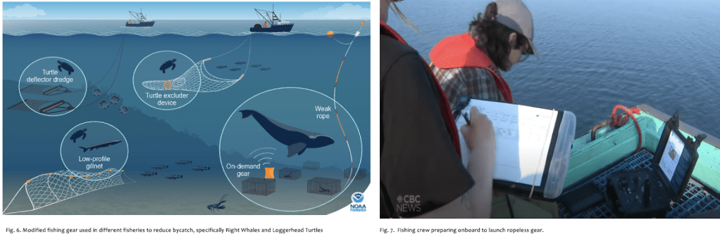 Of course no lobster or crab fisher wants to kill whales. They usually do not ever see the whale or turtle that becomes entangled by their own gear, but they are aware of how much “bycatch” occurs from fishing. This term refers to the capture of unintended species that usually die along with the intended targets. Bycatch ranges from the thousands of albatrosses impaled on long line tuna hooks, to turtles drowned in fish nets, to whales dying from entanglement from vertical fishing lines and other fishing gear. But there are alternatives, and several are seen in the figure below from NOAA Fisheries. “On-demand”, or ropeless fishing for lobsters and crabs, is an extremely successful alternative to the traditional method of using fixed ropes to connect a surface buoys to traps or nets on the ocean bottom, which may remain in place for weeks. Usually, these on-demand methods employ an inflatable air bladder that is activated by an acoustic signal from the fisher when it is time to lift the trap to the surface.