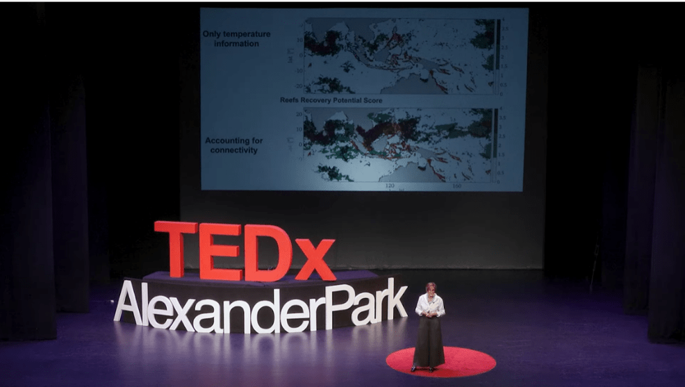 Figura 2. A Dra. Bracco descreve sua pesquisa de conectividade do ecossistema marinho via TEDx Talk.