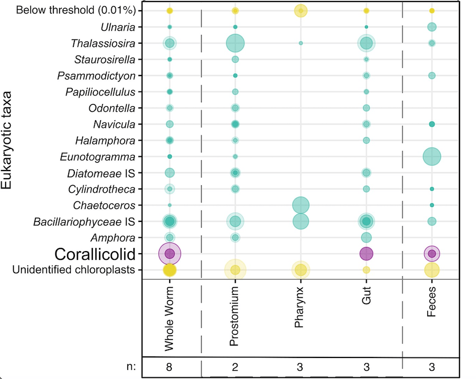 Figura 2. Abundancia relativa de distintos microbios en diferentes partes de los gusanos de fuego. Cuanto más grande es el punto, mayor es la abundancia del microbio. Los científicos encontraron parásitos de corales (corallicólidos), mostrados en color morado en la figura, en el intestino y en las heces de los gusanos de fuego. Figura tomada de Bonacolta et al. 2025.