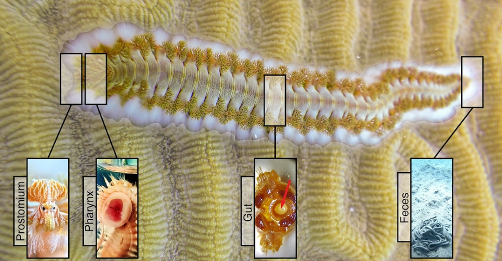 Figura 1. El gusano de fuego que se muestra aquí consume tejido coralino. Imagen tomada de Bonacolta et al. 2025.