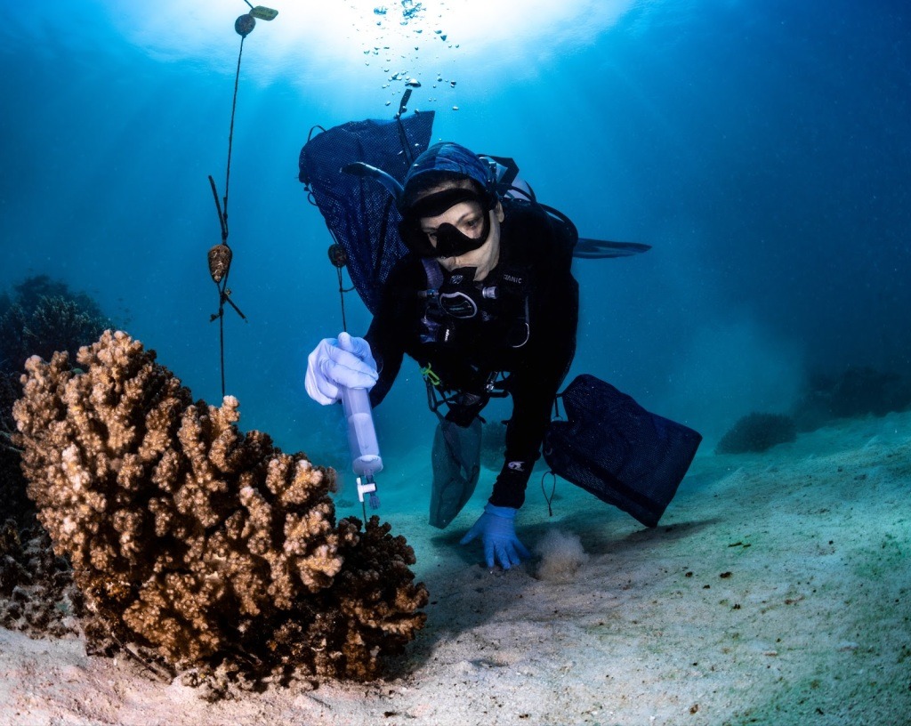 Figura 1: Profa. Raquel Peixoto aplicando probióticos em corais. Foto: Morgan Bennett-Smith.