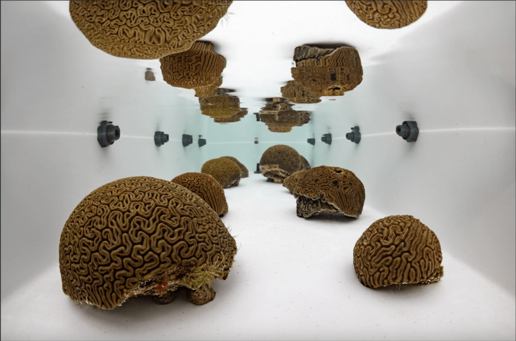 Diploria labyrinthiformis corals in a research tank at the University of the Virgin Islands. Photo by Dan Mele.