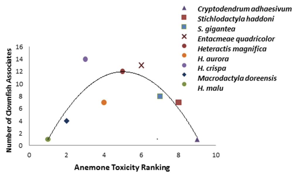 Figura 4. Toxicidad del veneno de las anémonas en comparación con el número de especies de peces anémona que se asocian con ellas. Tomado de Nedoskyko et al., 2014.
