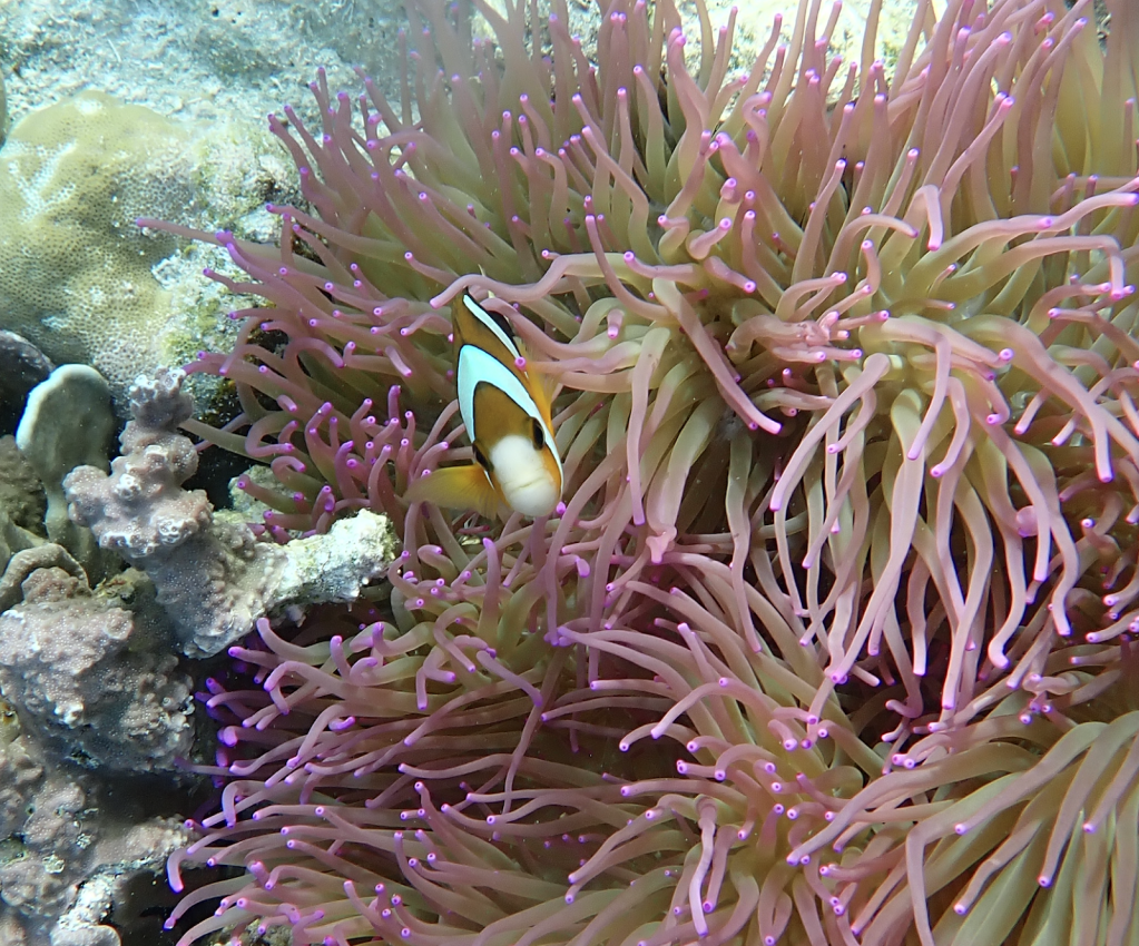 Figura 2. Una de las diez únicas anémonas que albergan peces payaso, aunque abundan las formas de color. Foto de Caroline Rogers.
