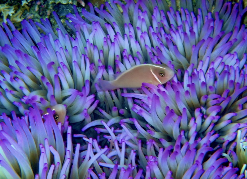 Figura 5. Una pareja de peces anémona rosados acurrucada entre los tentáculos de su anémona hospedera. Fotografía de Rebecca Gibbel