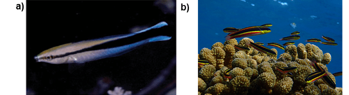 Figure 4. (a) Coloration of the cleaner fish Labroides dimidiatus. (b) Cleaner fish Thalassoma lucassanum, where the black stripe helps with identification. (Image a: Marshall and Cheney, 2011; Image b: Héctor Alejandro Hernández Castellanos).
