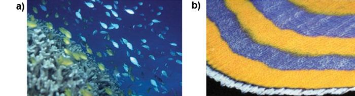 Figure 2. (a) Photograph showing how coloration allows fish to blend into their surroundings. (b) This anal fin on a P. diacanthus is an example of utilizing complementary colors (Images: Marshall and Cheney, 2011)