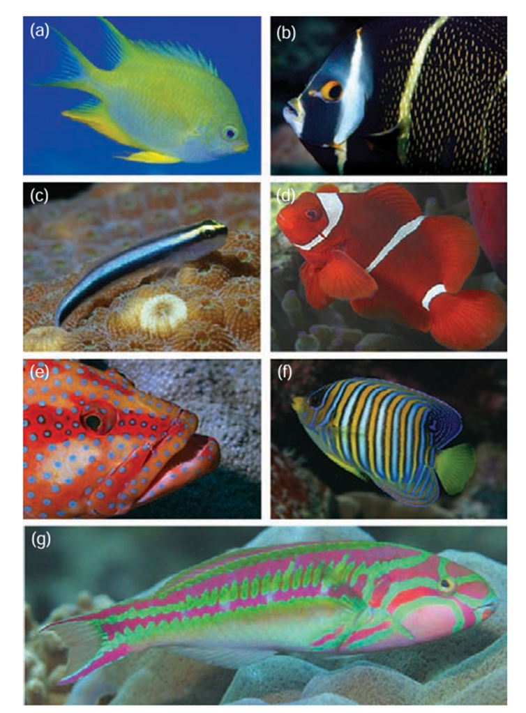 Figure 1. Diversity of colors and shapes in reef fish. (a) Golden damselfish Amblyglyphidodon aureus. (b) French angelfish Pomacanthus paru. (c) Cleaner goby Elacatinus evelynae. (d) Clownfish Premnas biaculeatus. (e) Grouper Cephalopholis miniata. (f) Angelfish Pygoplites diacanthus. (g) Five-stripe wrasse Thalassoma quinquevittatum (Figure: Marshall and Cheney, 2011)