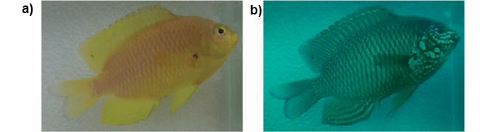 Figure 5. UV colors in damselfish become visible when photographed with a UV-sensitive camera (350–400 nm). (a) Ambon damselfish P. ambionensis, as seen by humans or by fish without UV sensitivity. (b) The same fish was photographed with a UV-sensitive camera, revealing a pattern of UV-reflective colors. (Image: Marshall and Cheney, 2011).