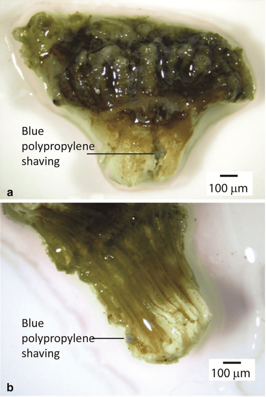 Microplastics found in the mouths of coral polyps (Hall et al., 2015).